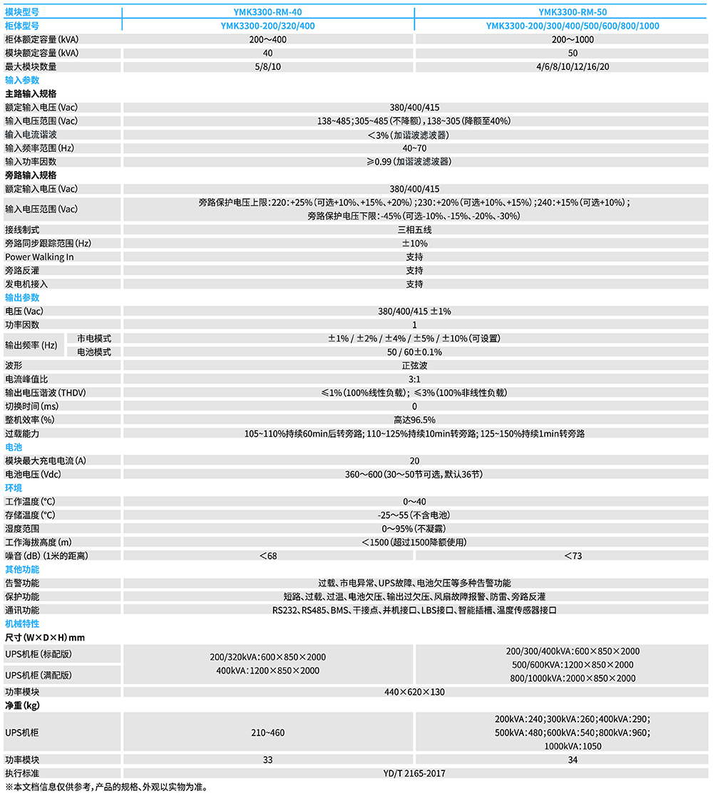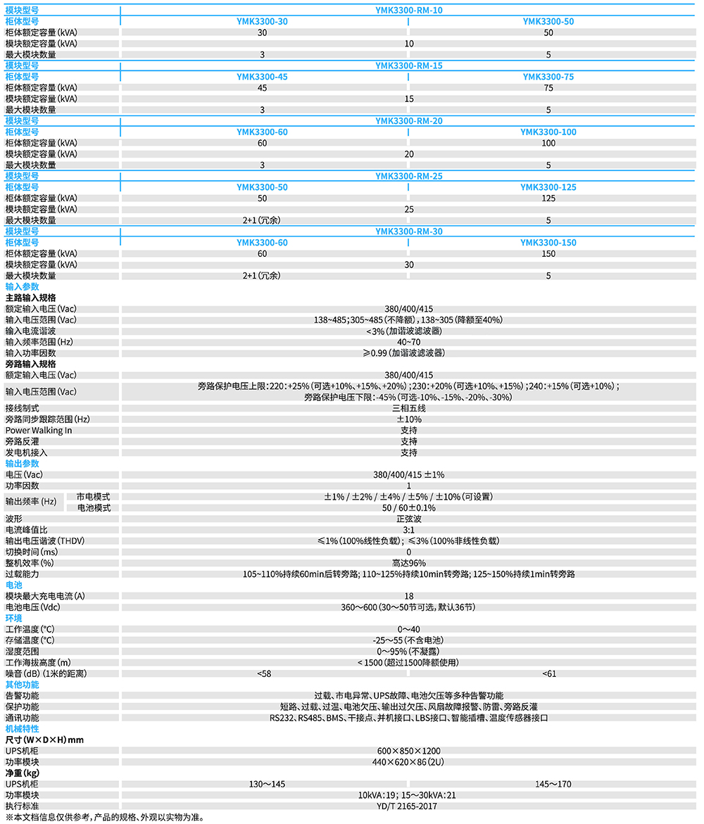 所有单元均采用模块化设计,包含功率模块、旁路模块、监控模块、配电模块(限单柜),功率模块为3U,旁路模块为3U,监控模块1U,配电模块11U,适配19英寸标准机柜