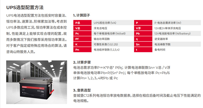山特城堡系列蓄电池采用先进的技术和生产工艺,在产品设计、技术指标和工艺控制上侧重于与UPS的兼容匹配和系统优化。并设计十年浮充寿命,选用V0防火等级外壳,适合UPS应用,是UPS备用电池领域的优势产品。