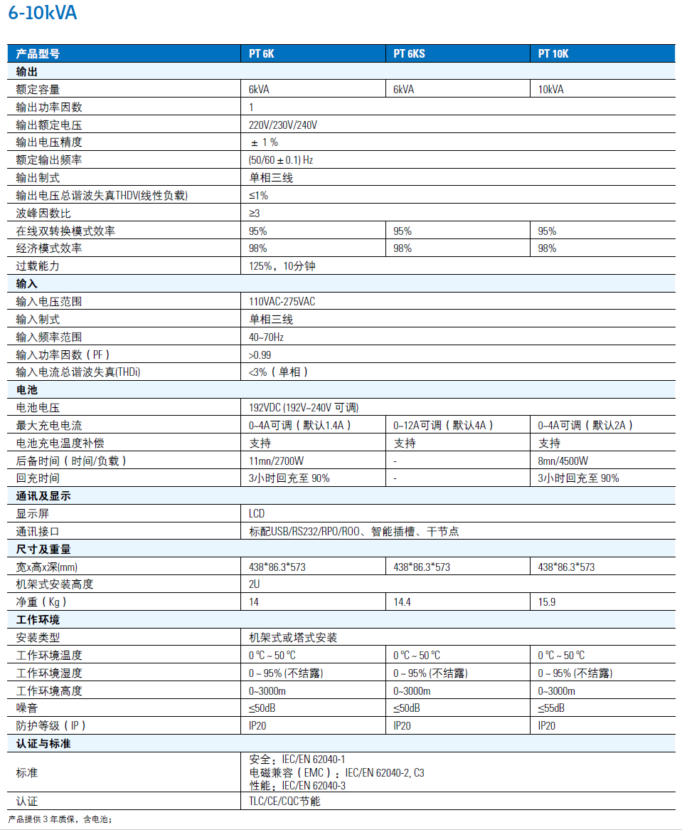 更高的效率,更小的体积。全系列输出功率因数为1,10kVA双转换模式效率高达95%,机架式安装时高度2U,深度小于600mm。